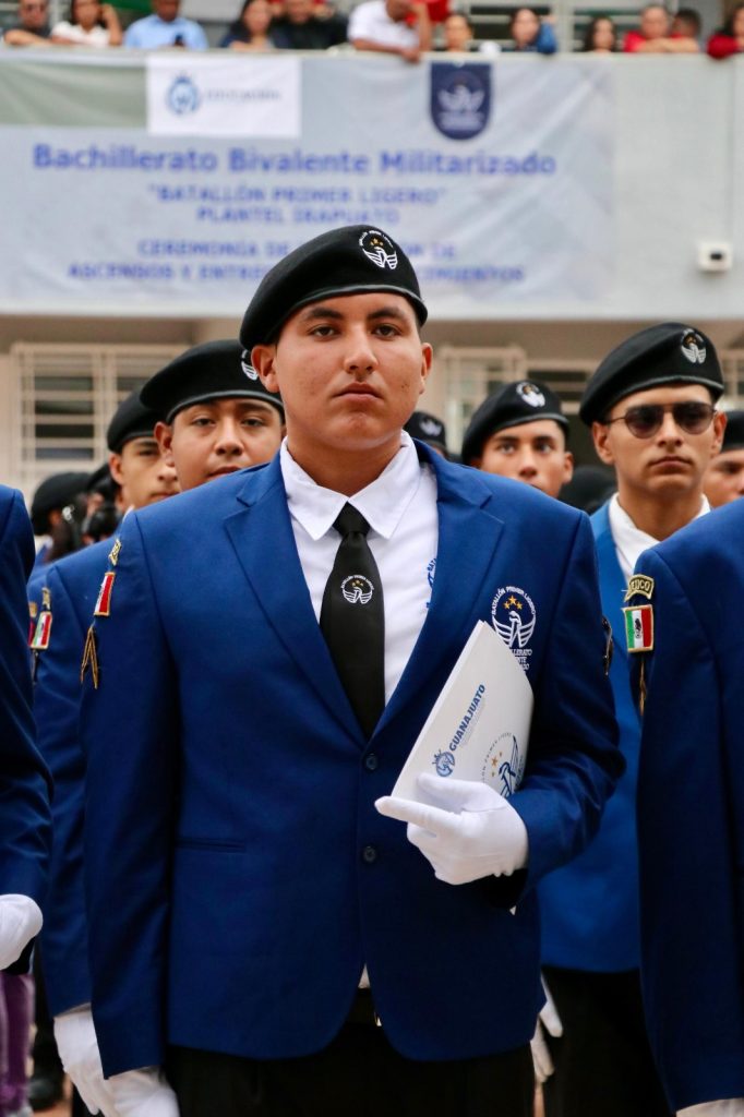 Alfonso Huerta Escoto, coordinador general del Plantel BBM Irapuato, explicó que el objetivo de los ascensos es fortalecer la autoestima y desarrollar actitudes de mando, liderazgo y habilidades socioemocionales entre las y los cadetes, quienes son promovidos sin distinción de género, considerando su promedio académico.