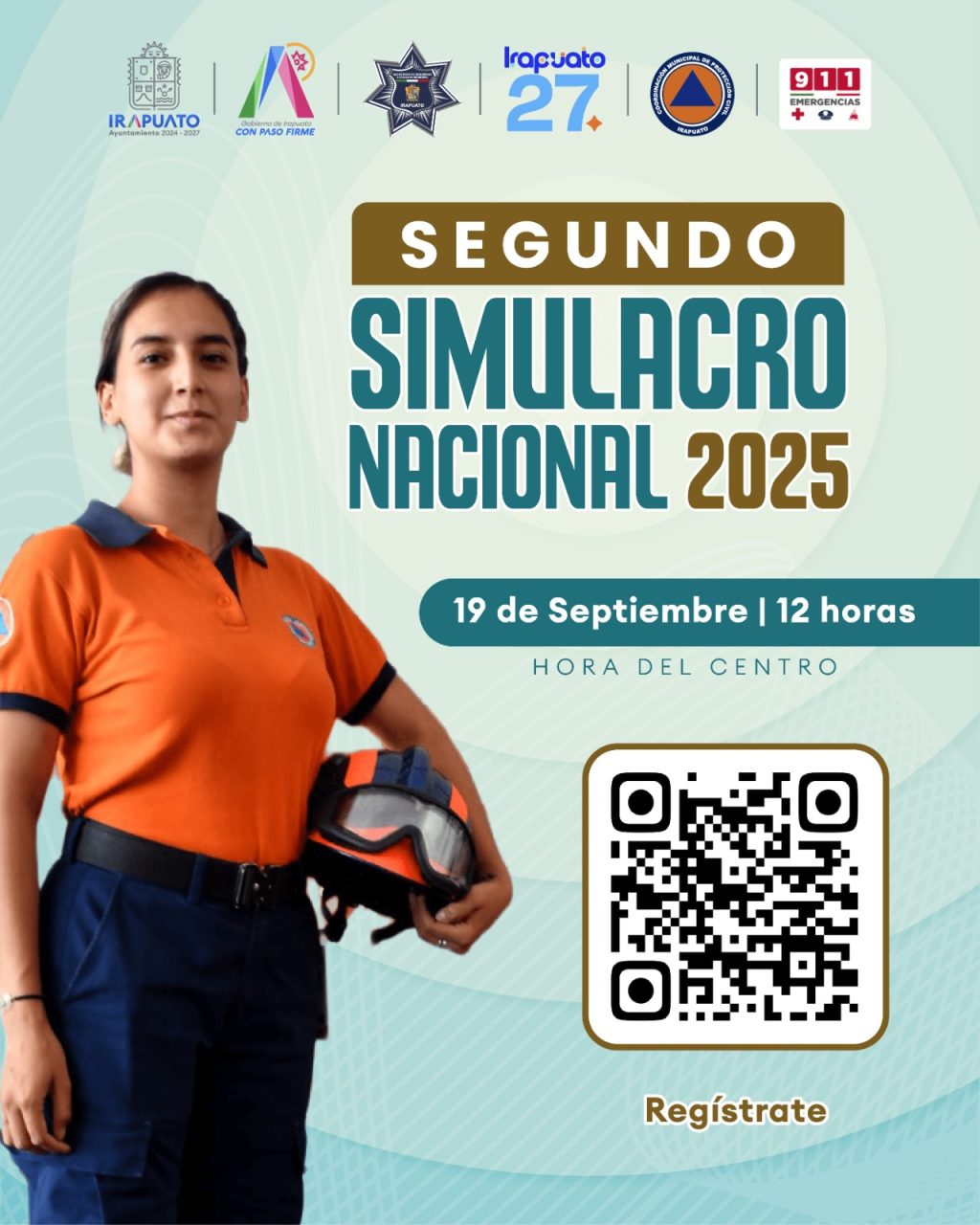La preparación y la organización son esenciales para salvar vidas en una emergencia real.El Gobierno Municipal, a través de la SSC, hace un llamado a sumarse de manera ordenada al Segundo Simulacro Nacional de Sismo y fortalecer así la cultura de la prevención en Irapuato.