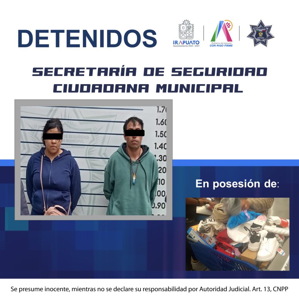 Irapuato, Gto. a 03 de septiembre de 2025.- Un hombre y una mujer, fueron detenidos por integrantes de la Policía Municipal de Irapuato, luego de haber sido señalados de sustraer diversa mercancía de un súper mercado ubicado en la avenida prolongación Guerrero a la altura de la colonia Ejido Juárez.